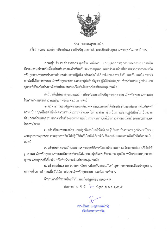 ประกาศเจตนารมณ์การป้องกันและแก้ไขปัญหาการล่วงละเมิดหรือคุกคามทางเพศในการทำงาน 2565
