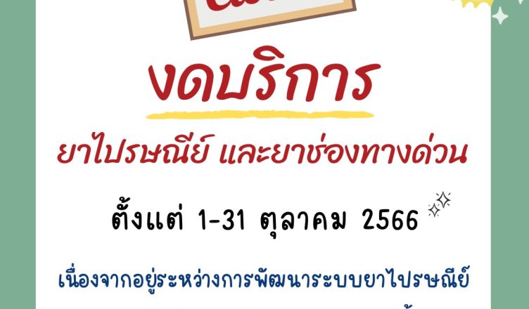 งดบริการยาไปรษณีย์ และยาช่องทางด่วน ตั้งแต่วันที่ 1-31 ตุลาคม 2566 ขออภัยในความไม่สะดวกมา ณ ที่นี้