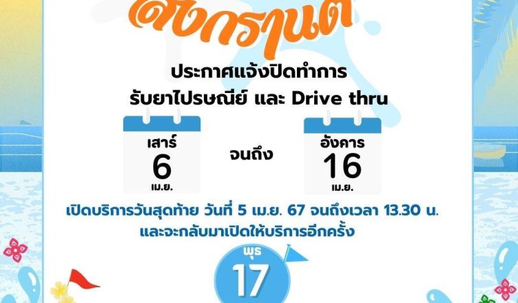 แจ้งปิดทำการรับยาไปรษณีย์ และ Drive Thru ในช่วงเทศกาลสงกรานต์